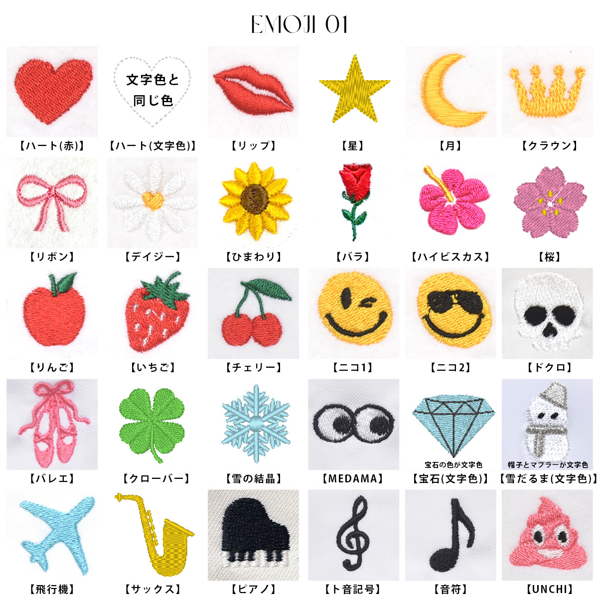 英字、数字、記号、ひらがな、カタカナ最大8文字+絵文字一つを刺繍できます。