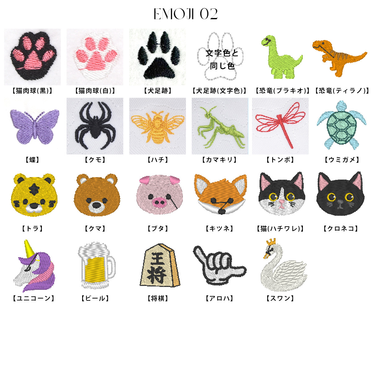 英字、数字、記号、ひらがな、カタカナ最大8文字+絵文字を刺繍できます。