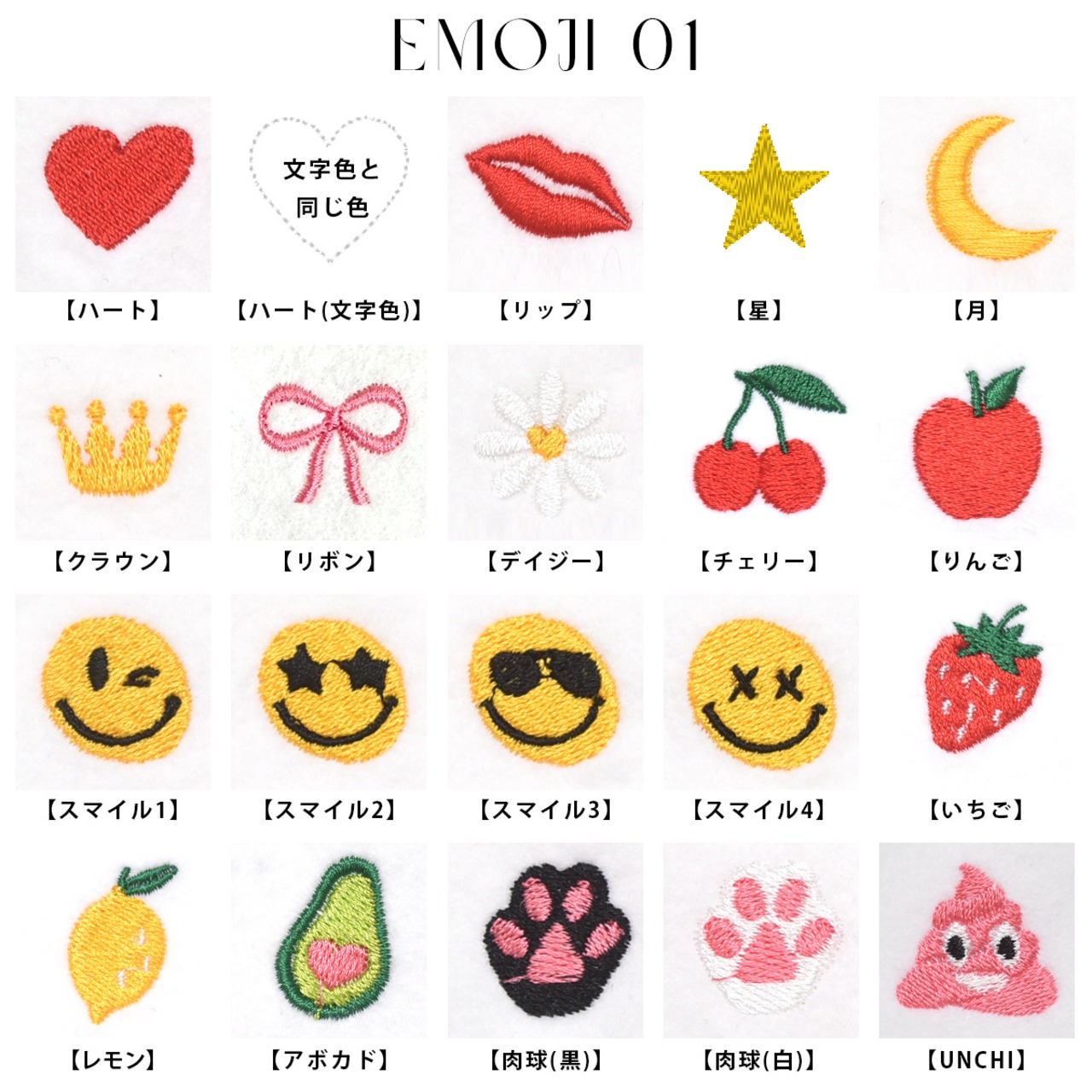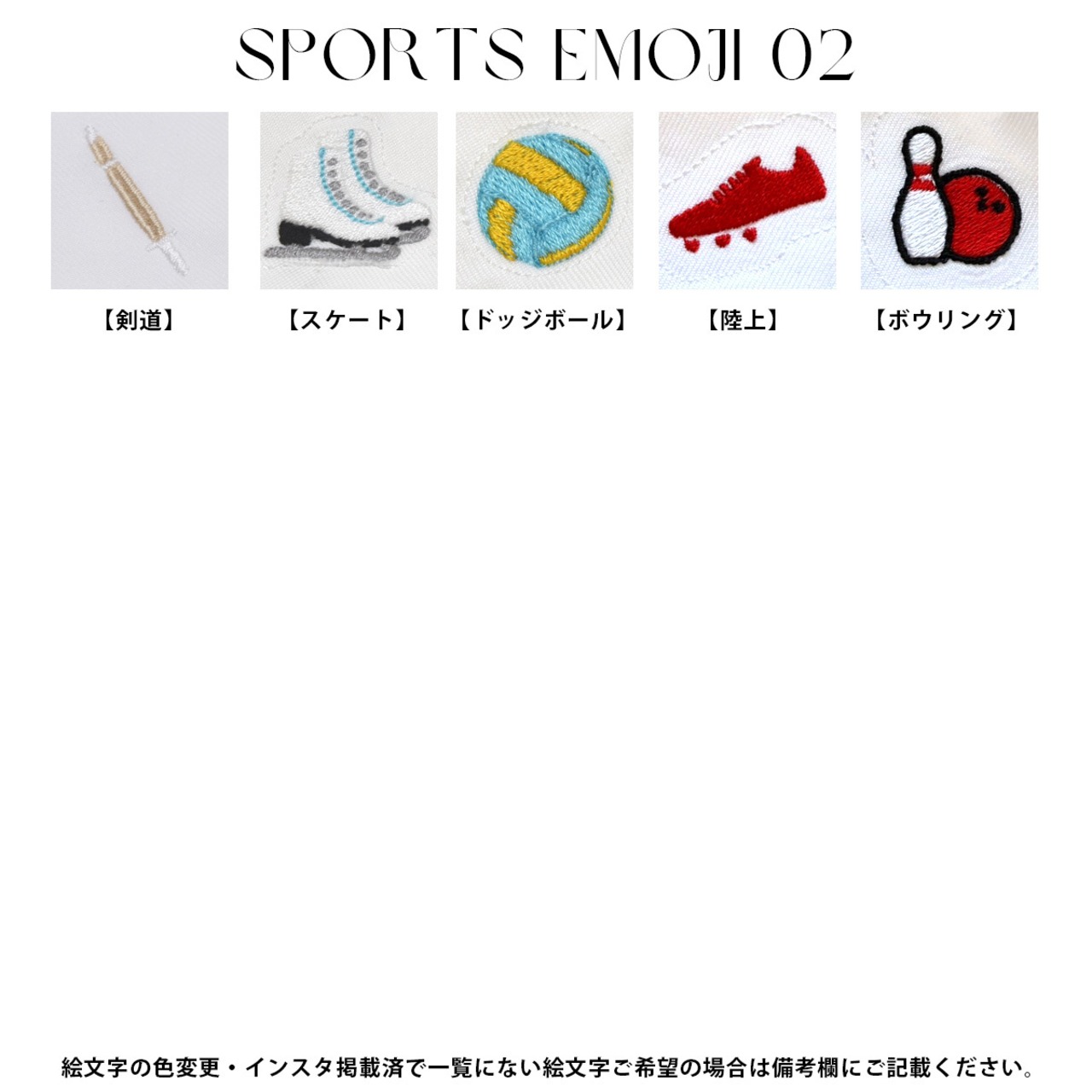 ※文字数は8文字(英字・数字・記号・ひらがな・カタカナ)+絵文字の刺繍が可能です。