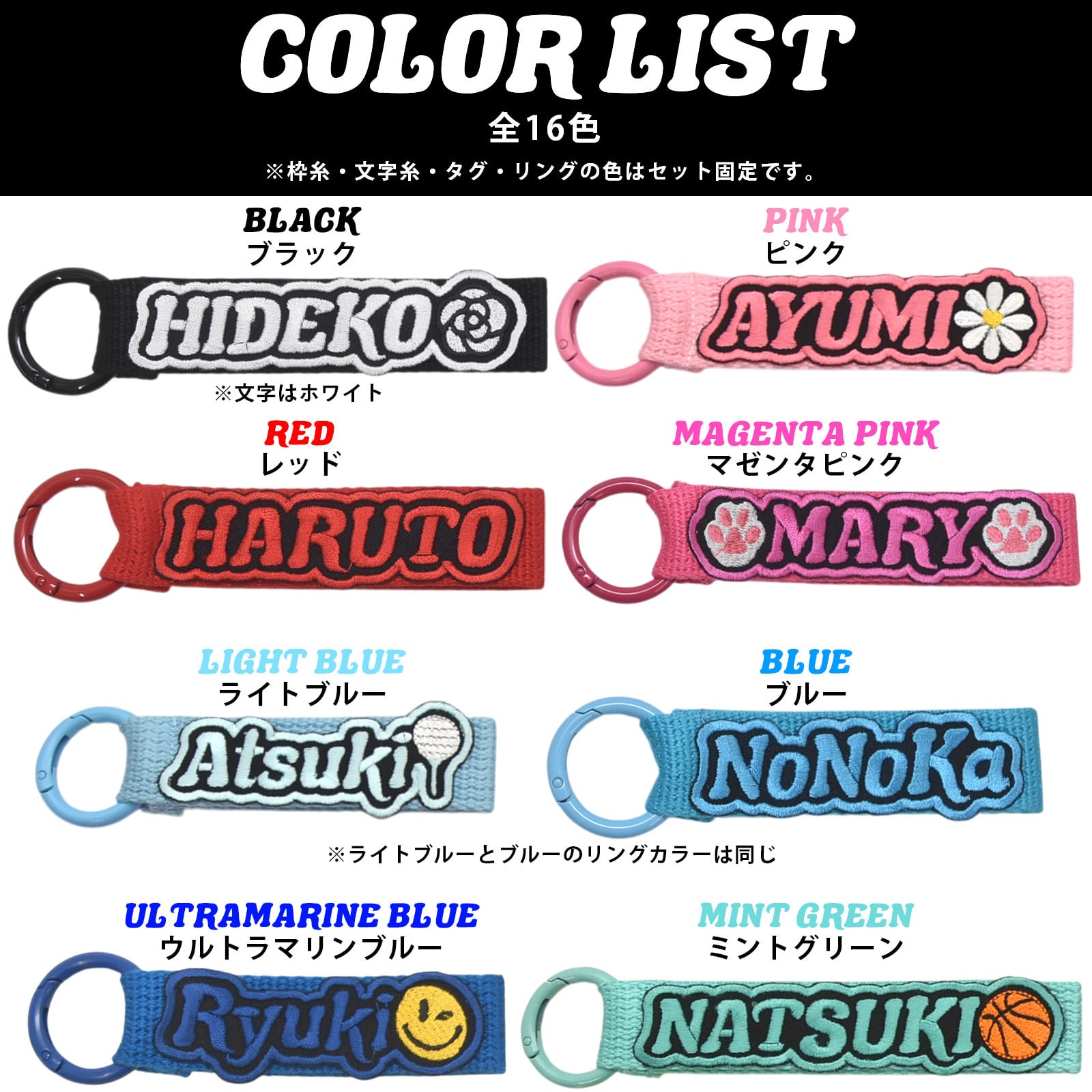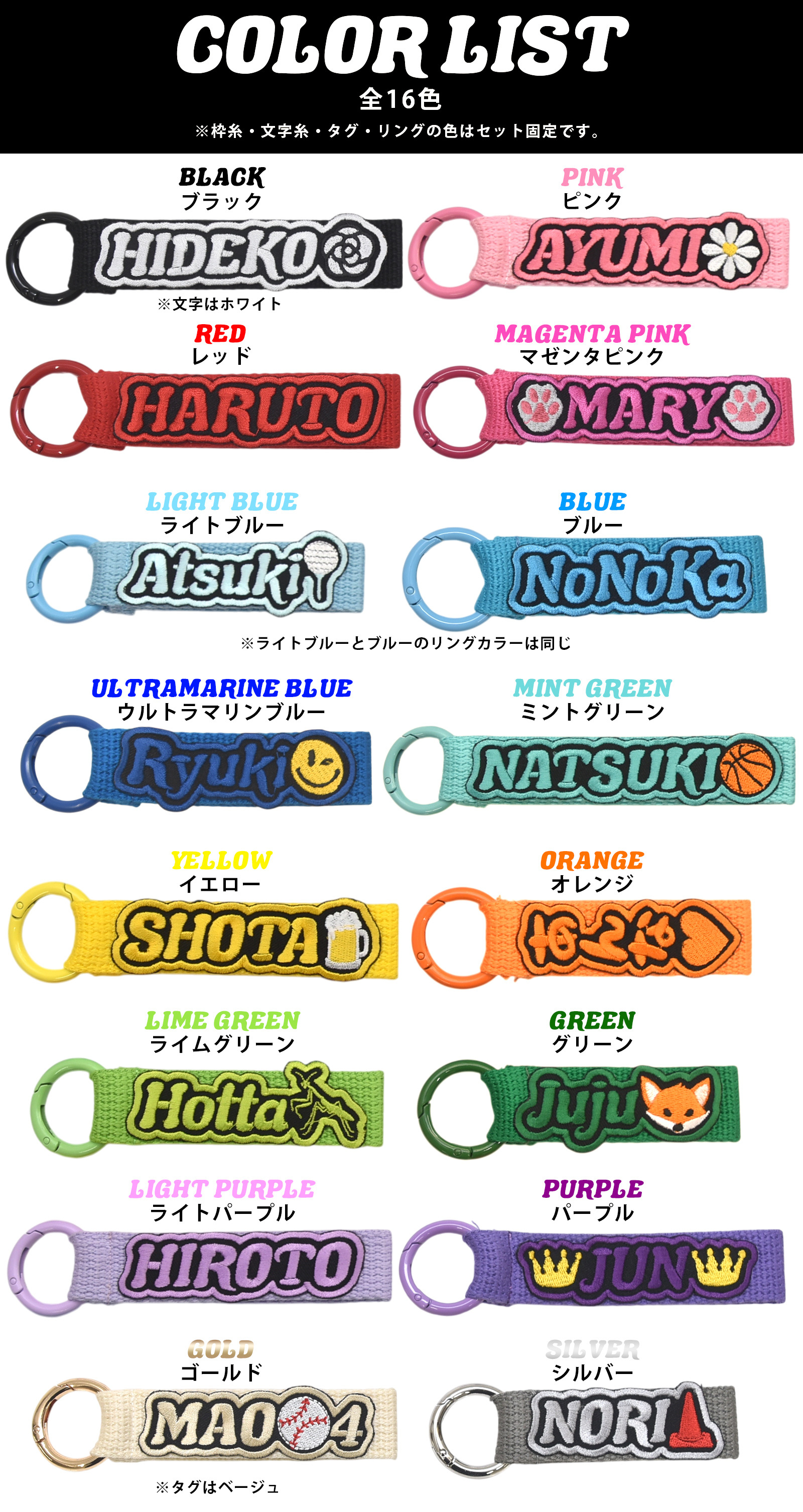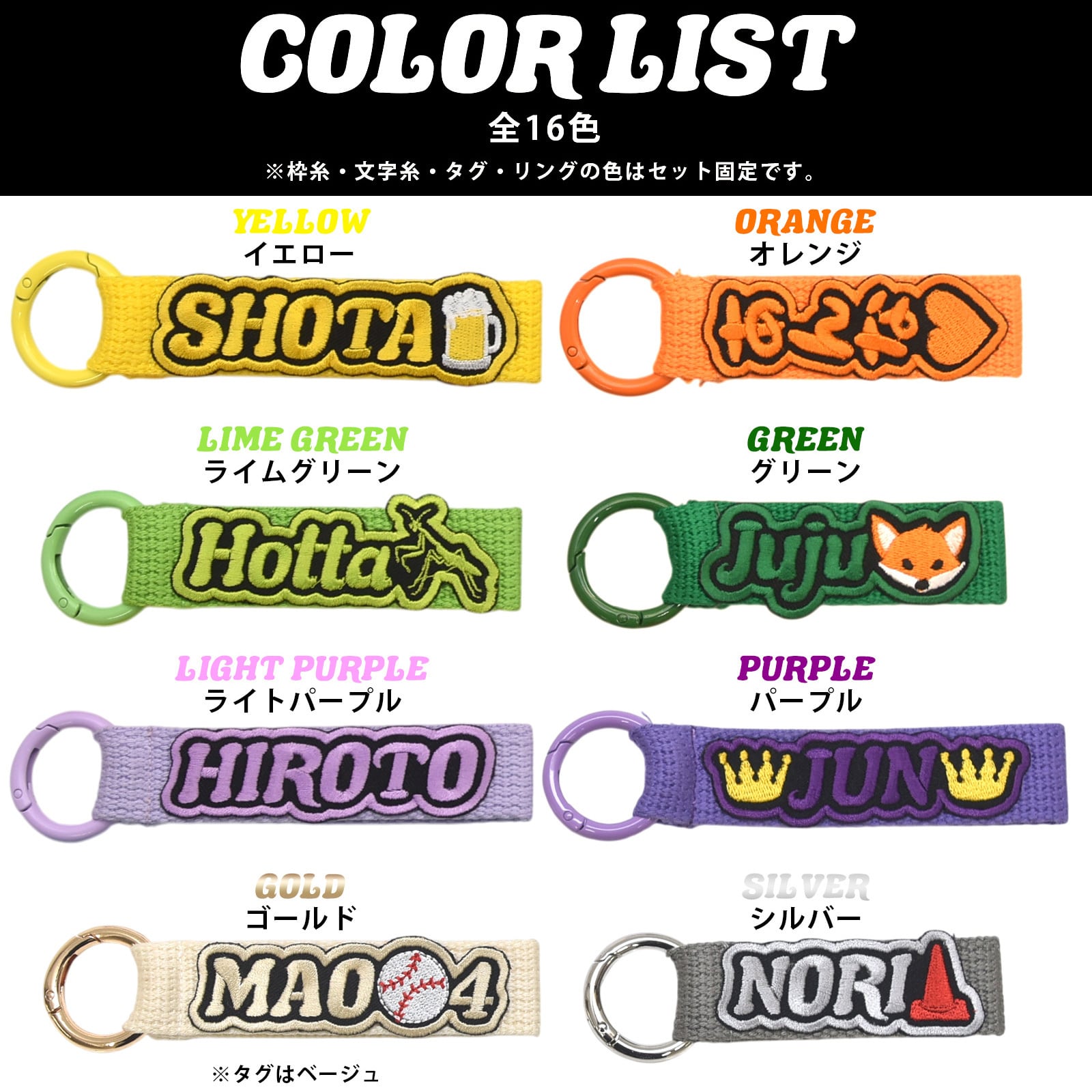文字と枠の糸色とネームタグとリングの色が全てセットになったカラーネームタグ