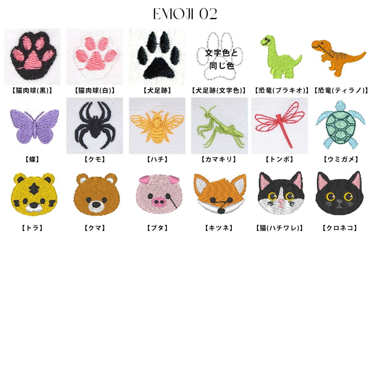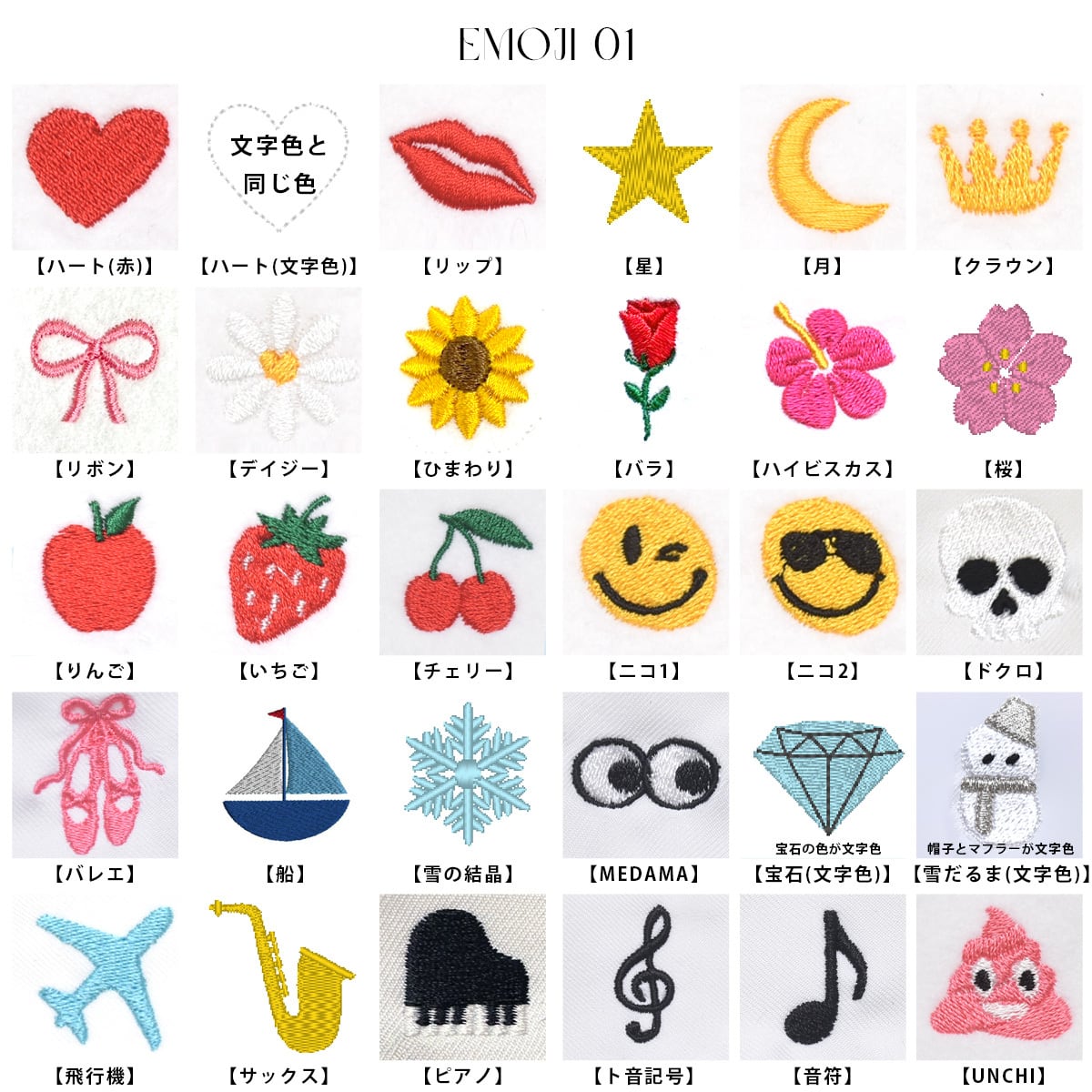 ※文字数は8文字(英字・数字・記号・ひらがな・カタカナ)+絵文字の刺繍が可能です。